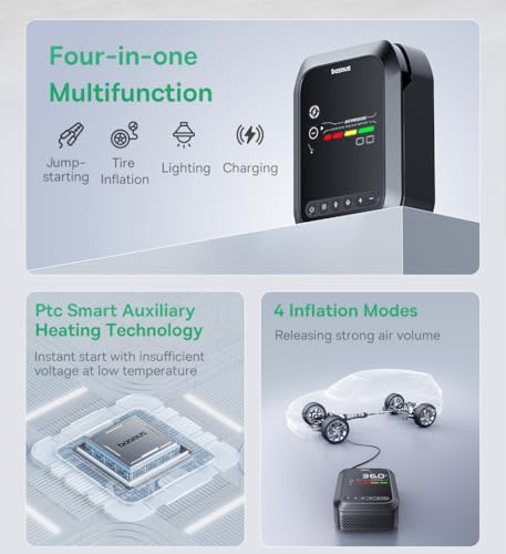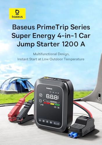 Baseus - ضاغط هواء لاسلكي 4 في 1 1034 كيلوباسكال (12000 مللي أمبير في الساعة) من باسيوس، جهاز تشغيل محرك السيارة-منفاخ هواء - مصباح يدوي - شحن سريع بشاحن باور بانك مع معزز بطارية 1200 أمبير، سلسلة برايم تريب