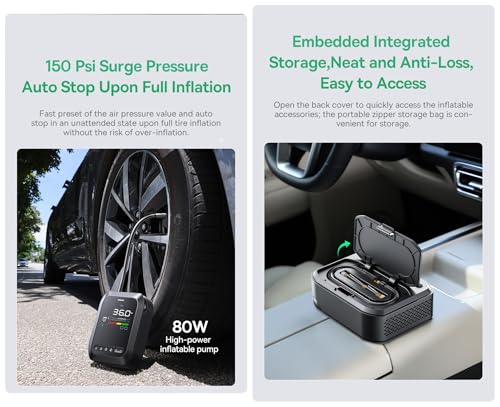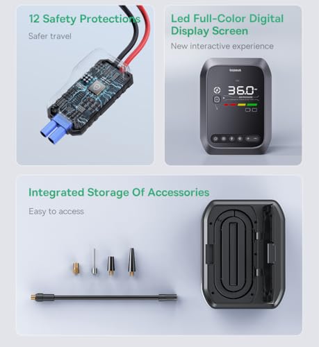 - ✅ الأداء: ضاغط هواء بقدرة 12000 مللي أمبير في الساعة، 44.4 وات ساعة، 1200 أمبير، 1034 كيلوباسكال.