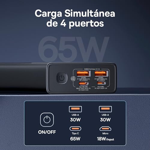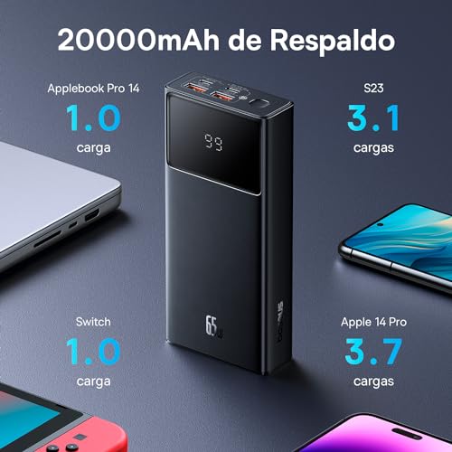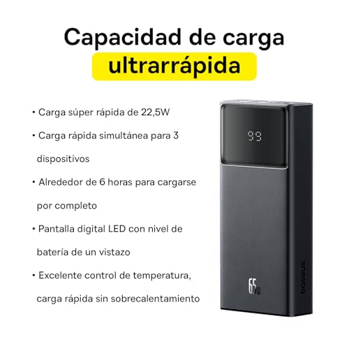 Baseus - شاحن باور بانك ستار لود بتقنية الشحن السريع بشاشة رقمية (20000 مللي امبير في الساعة - 65 وات - 5 فولت - 6 امبير) مع كابل شحن من USB الى نوع C بقوة 3 امبير بطول 0.3 متر من باسيوس - أسود