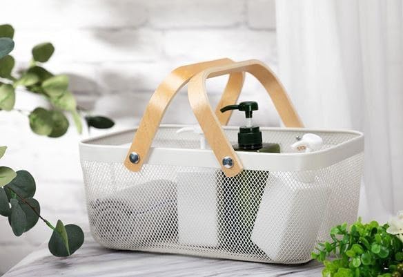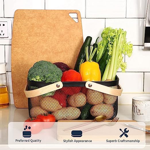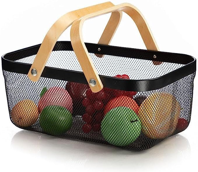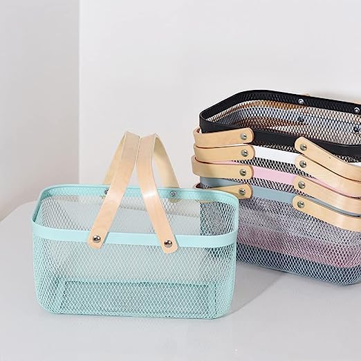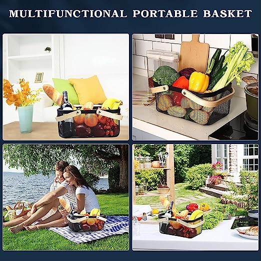 - تتميز سلة تخزين الطعام المحمولة باليد للنزهات بتصميم شبكي ومقابض خشبية لسهولة الحمل.