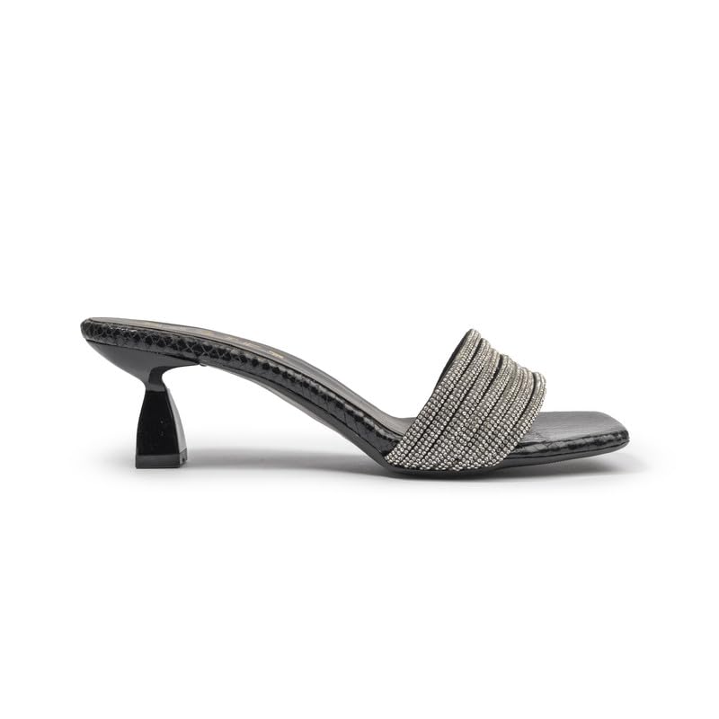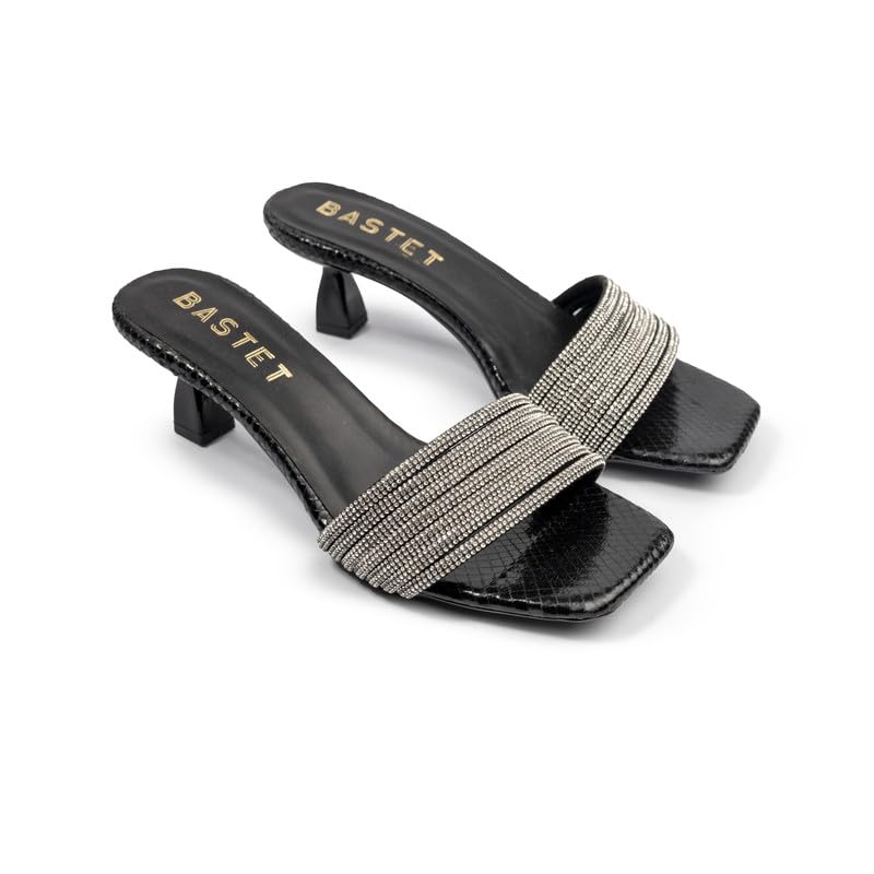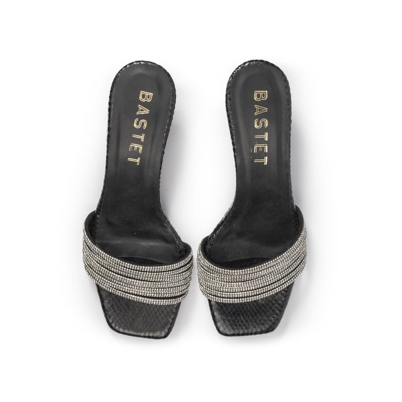 BASTET - صندل نسائي "هيدجيت" بكعب 5 سم مرصع باحجار الراين من باست - صندل انيق باشرطة للحفلات والسهرات - اسود