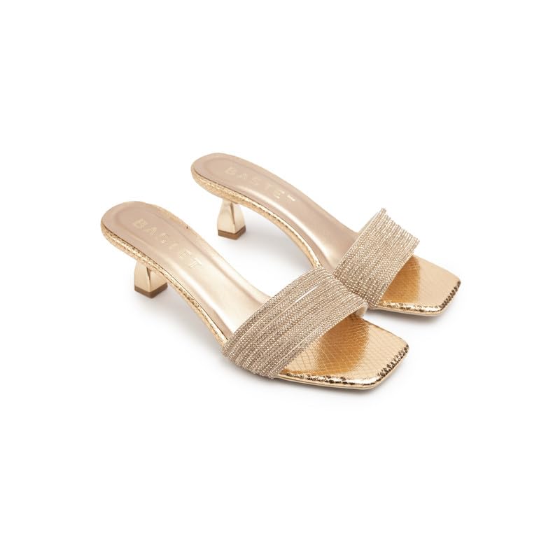 BASTET - صندل "هيدجيت" بكعب 5 سم مرصع باحجار الراين للنساء من باستي- صندل انيق باشرطة للحفلات والسهرات - ذهبي وردي
