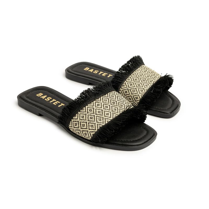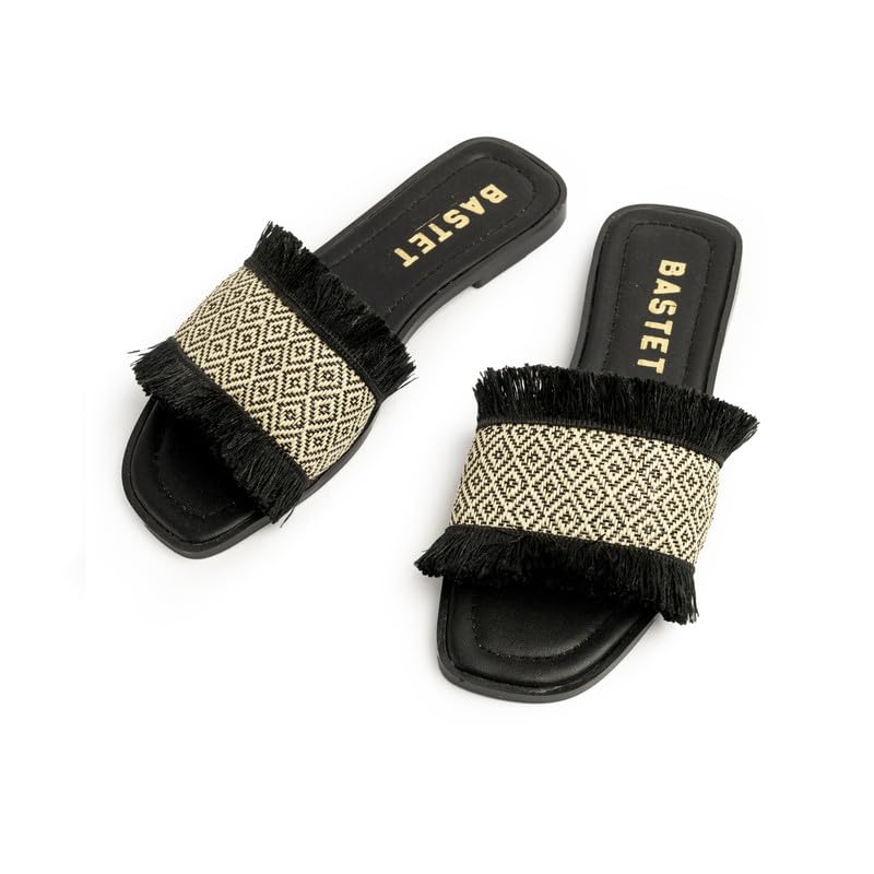 BASTET - شبشب نسائي مسطح من BASTET "Sopdet" - حزام منسوج هندسي مع شراشيب ؟ صندل بوهو سهل الارتداء بمظهر طبيعي - المقاس