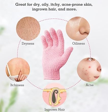 - مادة التصنيع: قفازات مصنوعة من نسيج خاص للتقشير بتصميم محبب يساعد على إزالة خلايا الجلد الميتة