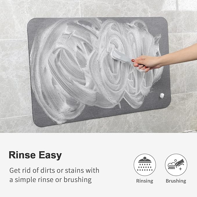 - 【شطف سهل】بفضل الطبقة التكنولوجية الجديدة، يتبخر الماء بسرعة، ولا يمكن للأوساخ والشعر الالتصاق بالسطح. لذلك، لن تحتاج إلى تجفيف أو تنظيف دواسة الحمام القابلة للغسل كل يوم. لا حاجة للغسيل في الغسالة! اشطفيها بالماء الدافئ للتخلص من البقع أو امنحيها تنظيفًا شاملًا بفرشاة. اتركيها لتجف في الهواء طوال الليل، وستتحول إلى جديدة تمامًا.