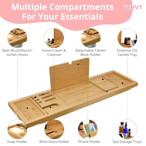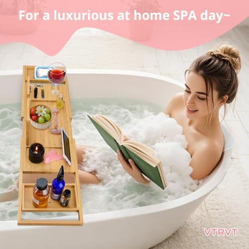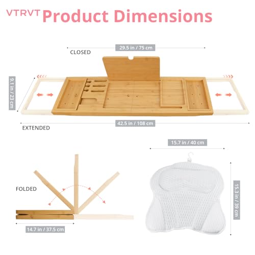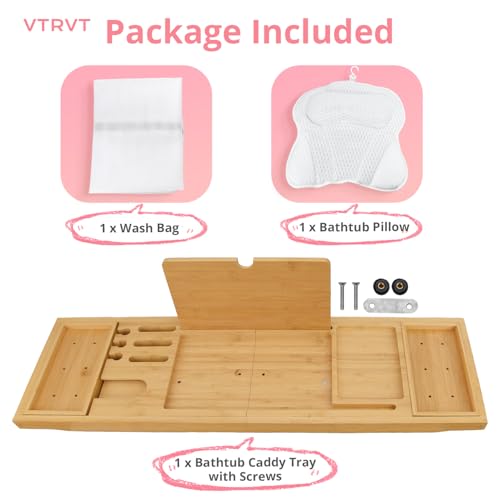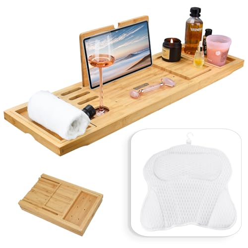 VTRVT - وسادة حمام لدعم الرقبة الخلفية وصينية لحوض استحمام قابلة للتوسيع والطي، منظم رف الدش (صينية طبيعية/وسادة بيضاء)