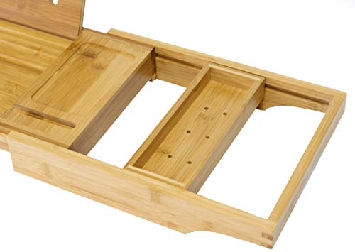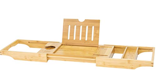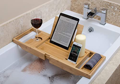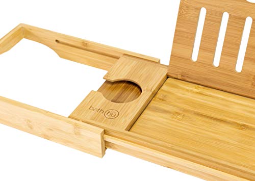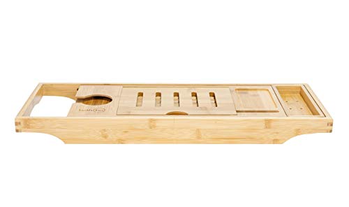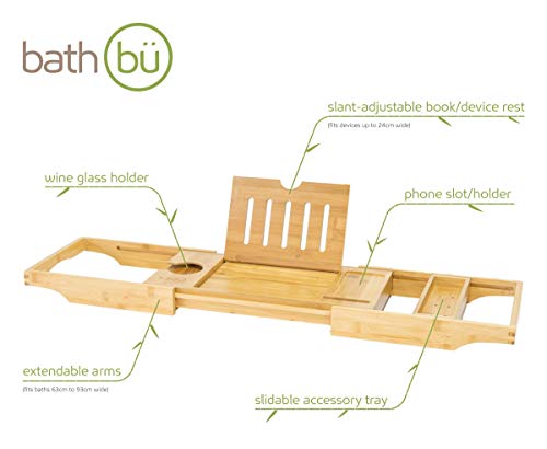 bathbü - صينية حمام من الخيزران بنسبة 100% | أذرع قابلة للتمدد (63-93 سم)، حامل للكتب/التابلت، حامل كؤوس النبيذ، صينية ملحقات، حامل موبايل وصينية منزلقة | صغيرة الحجم وتناسب معظم مقاسات الحمام من باثبو