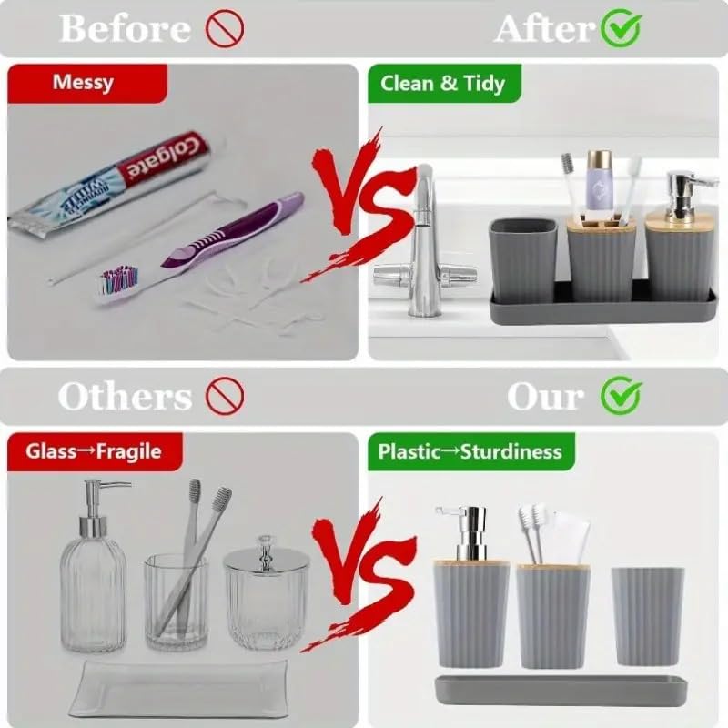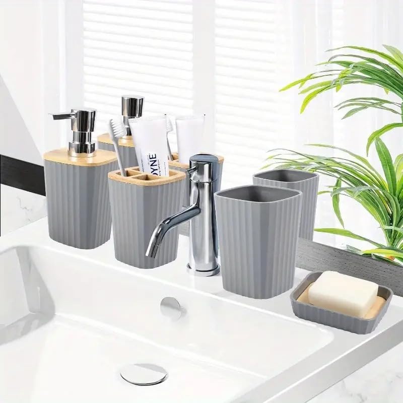 - 🛁 مجموعة كاملة من 6 قطع، تتضمن سلة مهملات وحامل فرشاة أسنان وموزع صابون وكوب وطبق صابون وحامل فرشاة التواليت.