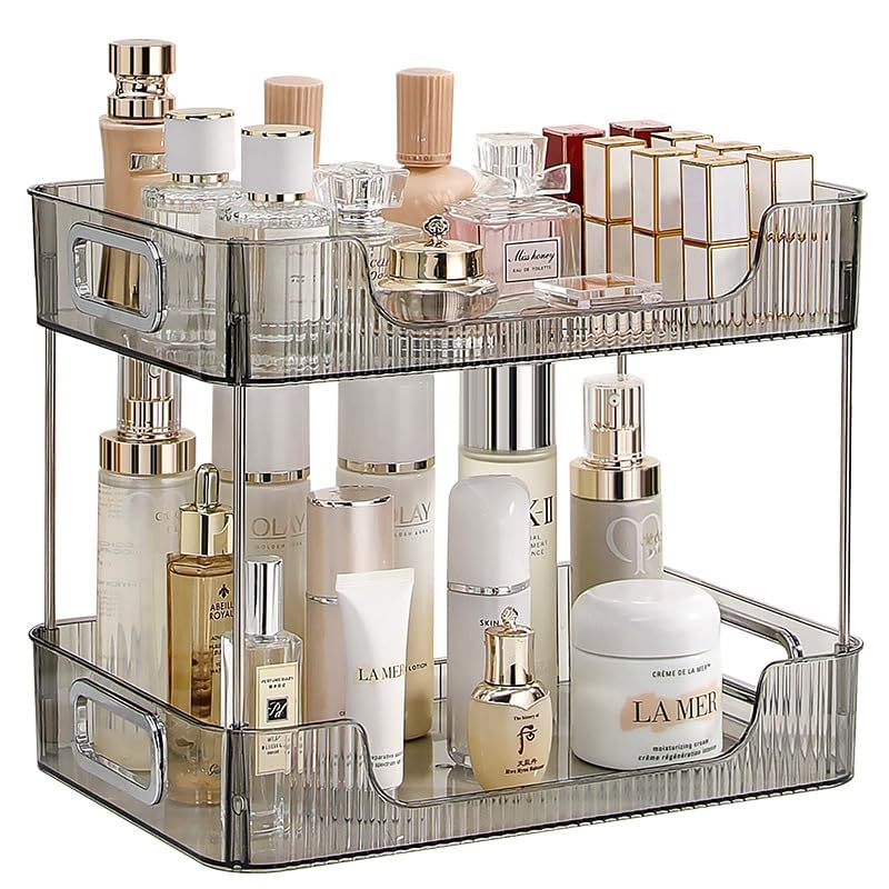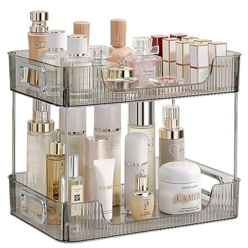 CESTATIVO - منظم منضدة الحمام، صينية زينة مكونة من طبقتين، رف تخزين مستحضرات التجميل، رف منظم للعناية بالبشرة في الحمام، باللون الرمادي