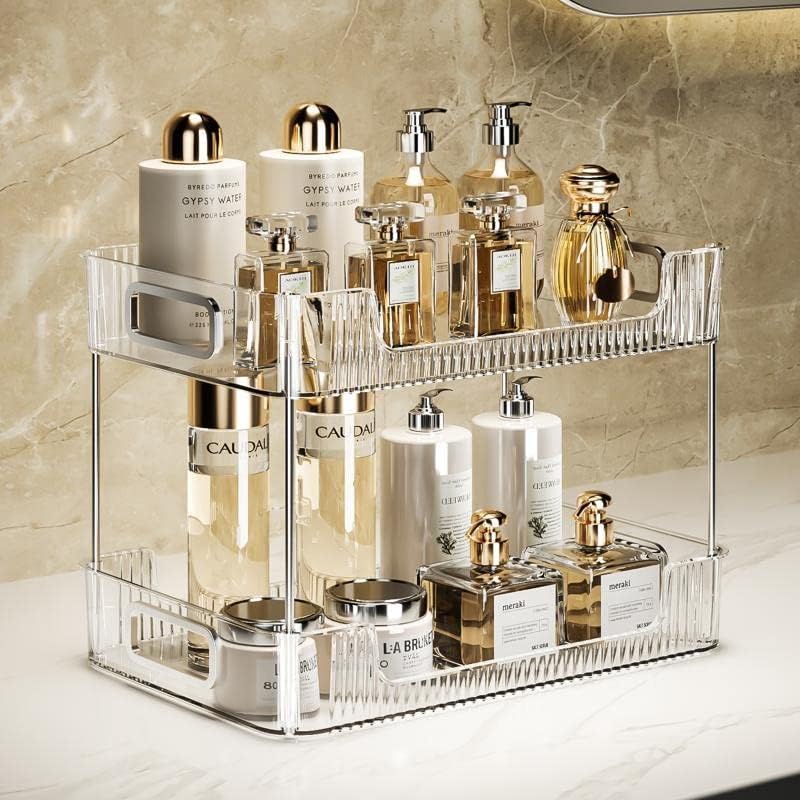 - الاستخدامات: يمكن لمنظم رف الحمام تخزين مستحضرات التجميل وأدوات الزينة والعطور وزجاجة العلاج بالروائح وأكواب القهوة والأكواب والشاي والقهوة والوجبات الخفيفة والمشروبات وزجاجات التوابل وزجاجات الصوص وخزانات تخزين الصغيرة وزجاجات تخزين وبعض أدوات الطبخ وساعة المنبه والتماثيل والديكورات والكتب وما إلى ذلك، ليكون منظم لأدوات التزيين ورف التوابل ومنظم المكياج والعطور ومنظم طاولة الحمام وفي المطبخ وغرفة المعيشة ومحطة القهوة وغرفة النوم وغرفة القراءة والمكتب وما إلى ذلك.