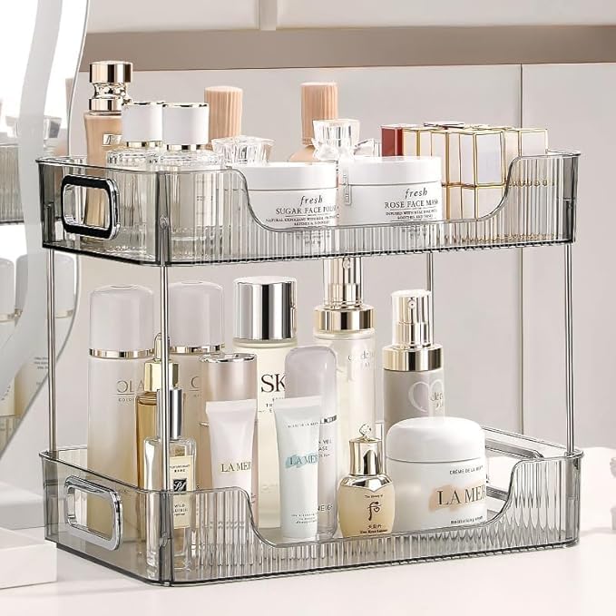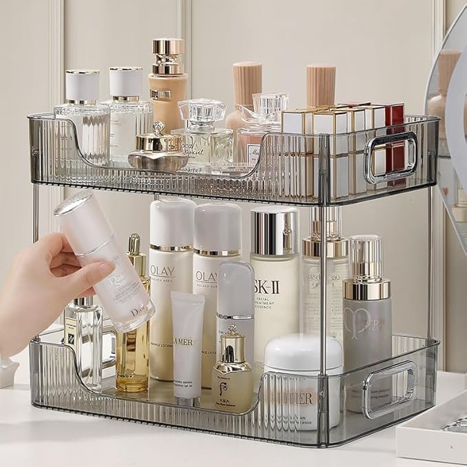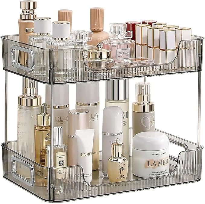 Generic - منظم حمام لسطح الطاولة، صينية فانيتي من طبقتين، رف منظم مكياج العناية بالبشرة، منظم الزينة، رف منضدة الحمام لمستحضرات التجميل ومستحضرات التجميل واللوشن والعطور، رمادي