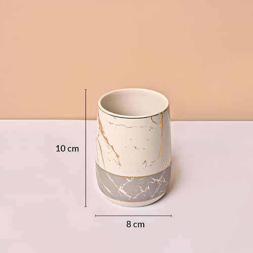 - تتضمن كوبين متعددي الاستخدامات يخدمان وظائف متعددة مثل الشطف أو التخزين، مما يوفر العملية والأناقة في تنظيم أساسيات حمامك.