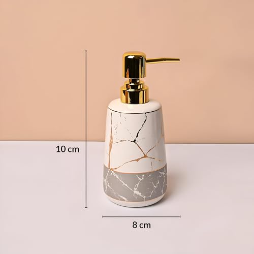 - يضيف موزع الصابون الأنيق مع غطاء ذهبي فاخر لمسة من السحر والرقي إلى ديكور حمامك، مما يجعل الروتين اليومي أكثر متعة وصقل.