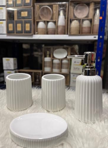 generic - طقم حمام لمظهر عصري في حمامك، المادة: بورسلين، الألوان: ابيض، اسود، رقم مضلع: 4 قطع، حامل فرشاة الاسنان، موزع جل الاستحمام، موزع صابون وكوب غسول الفم