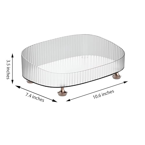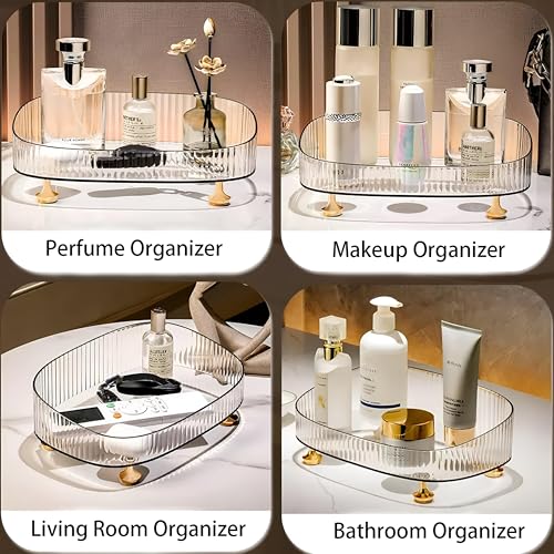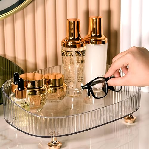 - تتميز صينية الأكريليك الأنيقة هذه بتصميم بيضاوي مع قاعدة ذهبية، تمتزج بسلاسة مع أي ديكور منزلي كمنظم عملي وقطعة أنيقة مميزة.
