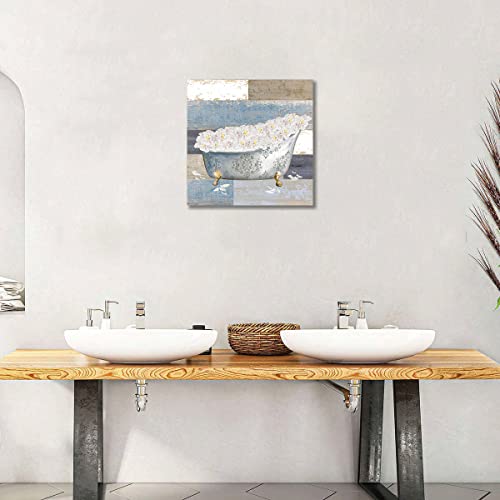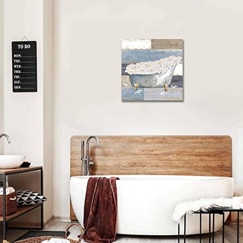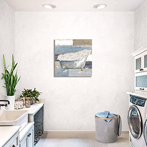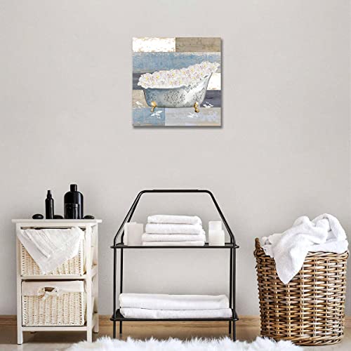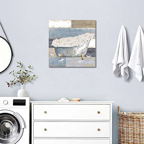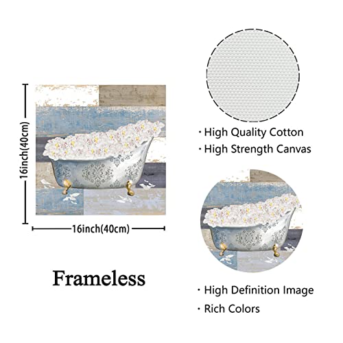 LAKEXINMART - ملصق حائط حوض الحمام بتصميم زهور ريفية من قماش الكانفاس بلون ازرق ريفي لوحة فنية مطبوعة الخشب صورة لغرفة النوم والحمام والمرحاض وديكور المنزل مقاس 16 × انش بدون اطار