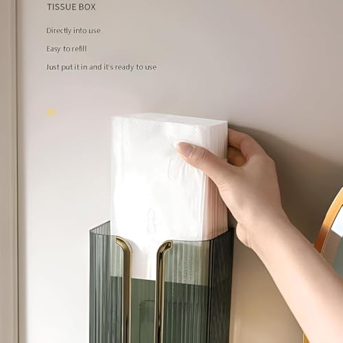 - تم تصميم حامل المناديل المثبت على الحائط لتوفير كفاءة في المساحة، حيث يتم تركيبه بسهولة على جدران الحمام، مما يساعد على توفير مساحة على الطاولة والحفاظ على بيئة نظيفة ومنظمة بفضل تصميمه متعدد الوظائف الذي يعمل أيضًا كرف تخزين للملحقات مثل العطور ومنتجات التزيين.