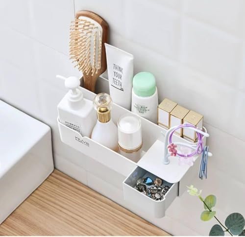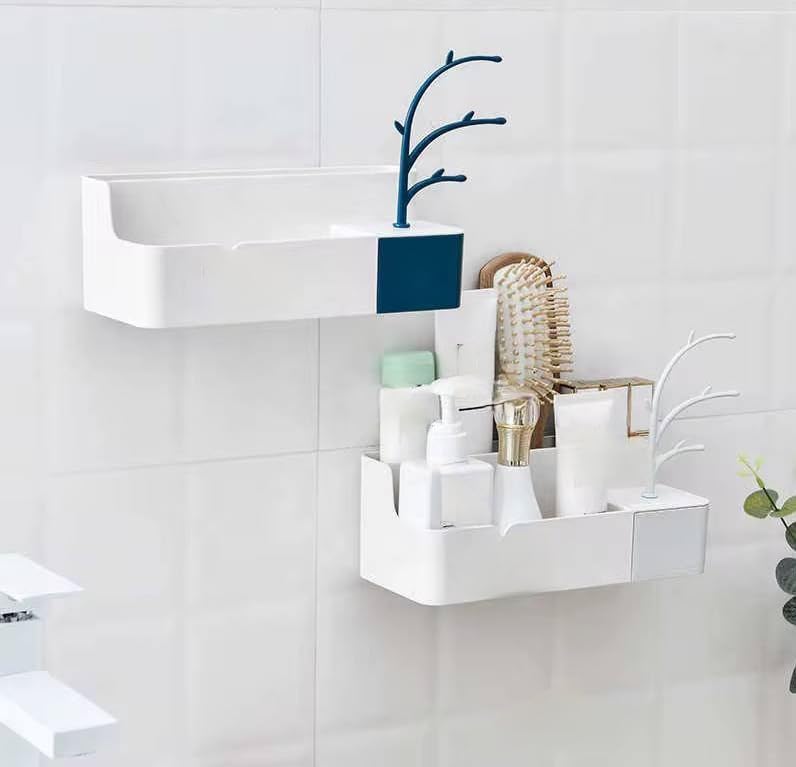 - تصميم متعدد الوظائف: منظم حمام جداري يتضمن رف تخزين واسع مع أقسام متعددة، حامل فرشاة أسنان، حامل مجوهرات على شكل شجرة، ودرج صغير لتنظيم جميع مستلزماتك