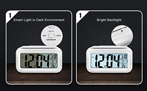 KONGS KIND KING - ساعة منبه رقمية تعمل بالبطارية سهلة التشغيل وصغيرة مع مصباح ليلي ذكي وخاصية عرض درجة الحرارة والتاريخ للاماكن الداخلية مكتب/الاطفال/الذين ينامون بعمق/جانب السرير (ابيض)، من كونغز اند كينغ