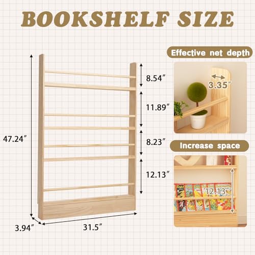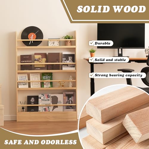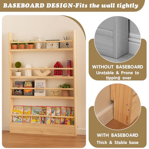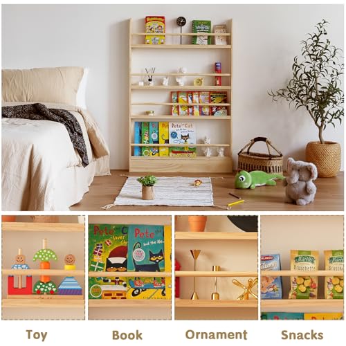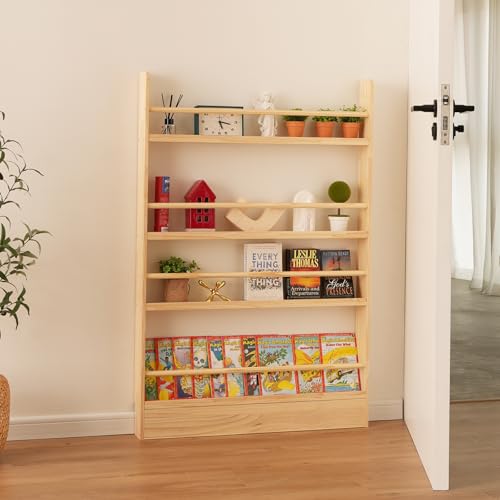 Baveke - رف كتب للاطفال من بافيك، 4 ارفف خلف الباب، خزانة كتب خشبية صلبة موفرة للمساحة، رف كتب يثبت على الحائط لغرفة النوم وغرفة المعيشة (خشب طبيعي)
