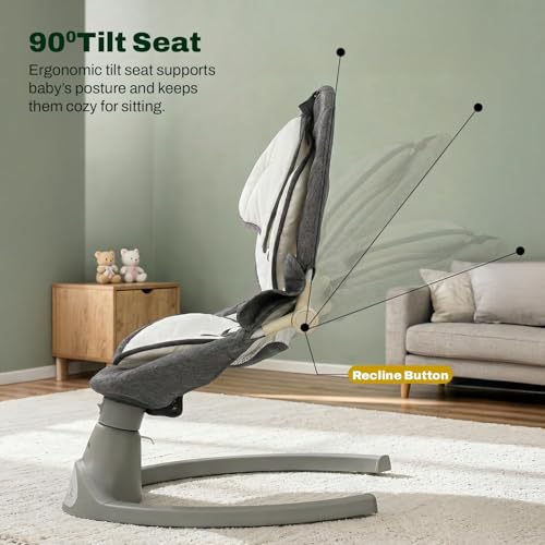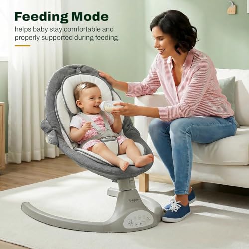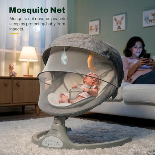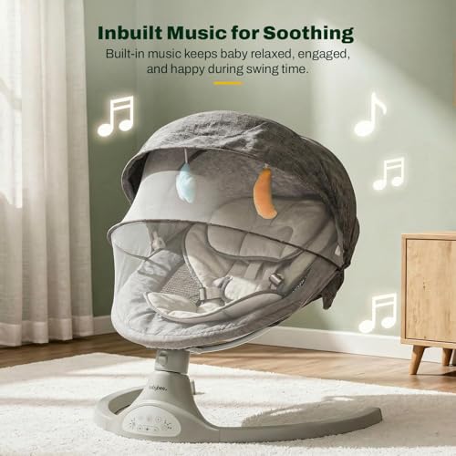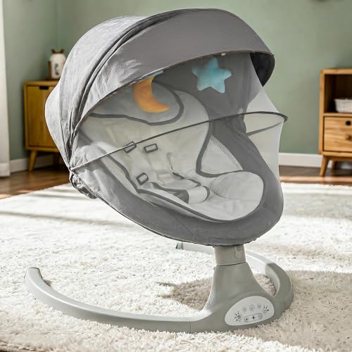 BAYBEE - مهد أرجوحة كهربائية أوتوماتيكية مع سرعة قابلة للتعديل وموسيقى هادئة، كرسي هزاز للأطفال مع ناموسية وحزام أمان وألعاب قابلة للإزالة من بايبي (رمادي)