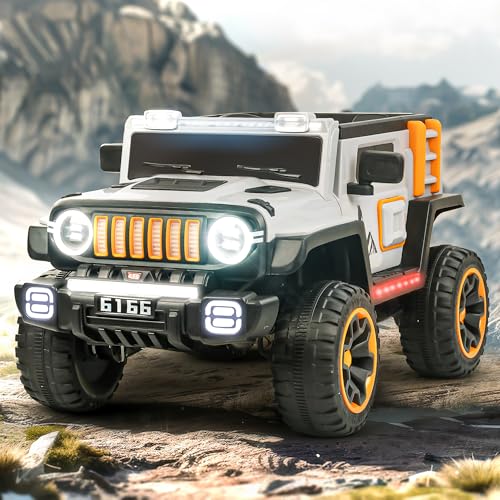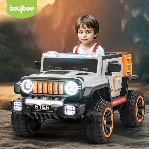 BAYBEE - سيارة جيب تعمل بالبطارية للأطفال بليزر من بايبي، لعبة ركوب بموسيقى وأضواء، سيارة أطفال ببطارية قابلة لإعادة الشحن، لعبة جيب كهربائية للقيادة من عمر 3 إلى 8 سنوات للأولاد والبنات (بليزر جراي/برتقالي)