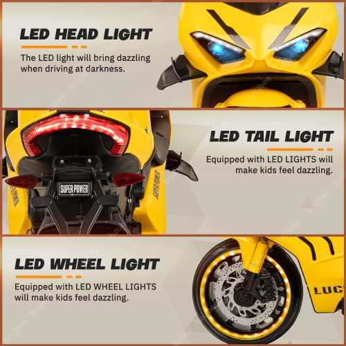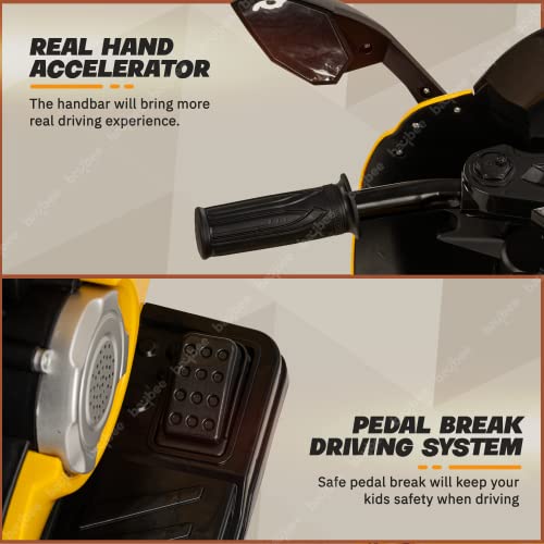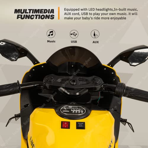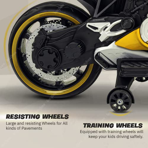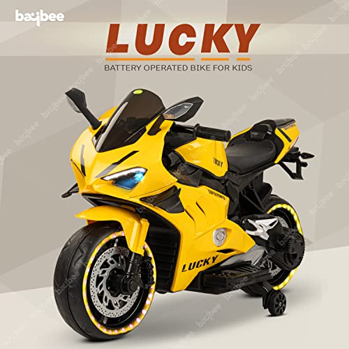 BAYBEE - دراجة أطفال لاكي من بايبي تعمل ببطارية قابلة لإعادة الشحن من بايبي، دراجة سباق مع ضوء وموسيقى | دراجة كهربائية للأطفال الأولاد والبنات بسن 3 إلى 8 سنوات (أصفر)