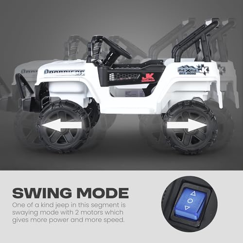 - وضع التأرجح الديناميكي مع محركات مزدوجة️: تتميز سيارة جيب التي تعمل بالبطارية بوضع تأرجح فريد مدعوم بمحركات مزدوجة، مما يوفر رحلة مثيرة مع زيادة السرعة والقوة للمستكشفين الصغار المغامرين.