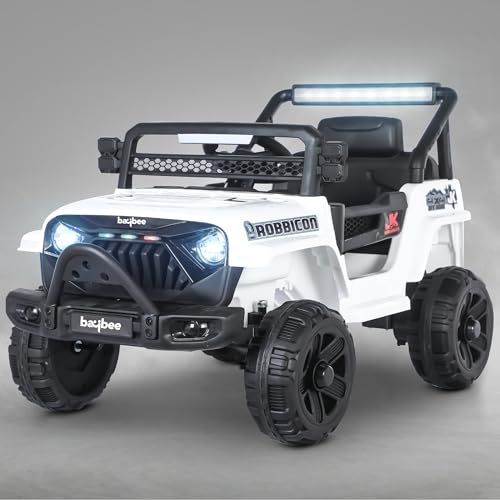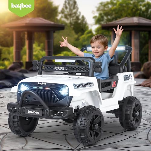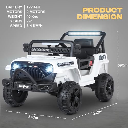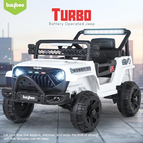 BAYBEE - بايبي سيارة جيب كهربائية تعمل ببطارية تربو للاطفال مع ضوء LED وموسيقى، سيارة سباق قابلة لاعادة الشحن تعمل بالبطارية للاطفال من عمر 2-7 سنوات للاولاد والبنات (ابيض)