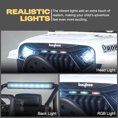 - محرك واقعي مع مصابيح LED : سيارة جيب بايبي تربو للأطفال، وهي سيارة كهربائية، مجهزة بمصابيح LED أمامية وإضاءة خلفية نابضة بالحياة، مما يوفر تجربة قيادة تحاكي عن كثب المركبات الحقيقية وتعزز وقت اللعب.