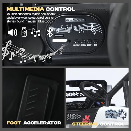 - الترفيه أثناء التنقل : تتضمن هذه السيارة القابلة لإعادة الشحن نظام تحكم مدمج في الوسائط المتعددة مع وصلات USB وAUX، مما يسمح للأطفال بتشغيل الموسيقى أو القصص أو المحتوى التعليمي المفضل لديهم مباشرة من لوحة القيادة.