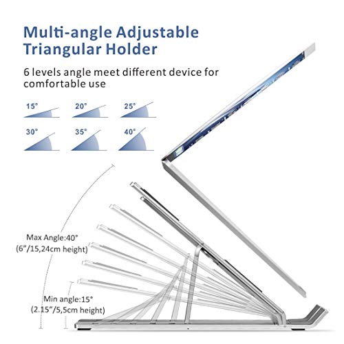 - تصميم متعدد الزوايا قابل للتعديل يمكن تعديل ارتفاع حامل اللاب توب والتابلت إلى 6 مستويات، ويمكن ضبط الزاوية والارتفاع حسب راحتك واحتياجاتك الفعلية ويُسهل التصميم المريح المشاهدة والكتابة، ويُخفف آلام الرقبة والكتف والعمود الفقري.