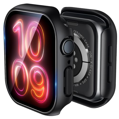 BAZO - بي اي زد او جراب اسود صلب من البولي كربونات متوافق مع ساعة ابل سلسلة 7/8/9 41 ملم مع واقي شاشة من الزجاج المقسى وحساس للمس، غطاء حماية شامل رفيع للغاية عالي الدقة لساعة اي ووتش 41 ملم - عبوة من قطعتين