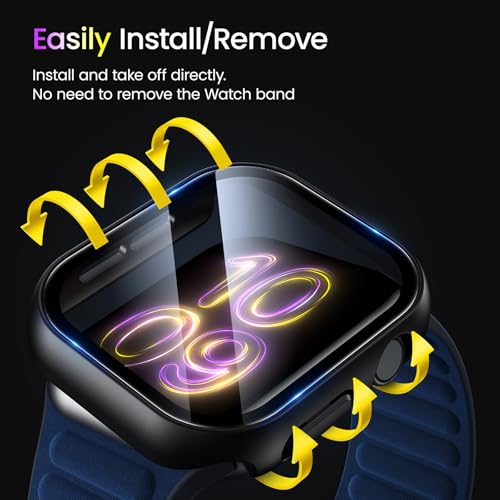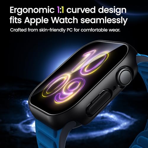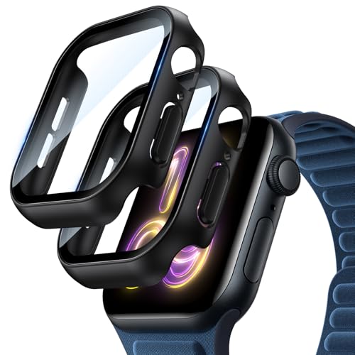 BAZO - بي اي زد او جراب اسود صلب من البولي كربونات متوافق مع ساعة ابل سلسلة 7/8/9 45 ملم مع شاشة حماية من الزجاج المقوى حساس للمس، غطاء حماية شامل رفيع للغاية عالي الدقة لساعة اي ووتش 45 ملم - عبوة من قطعتين