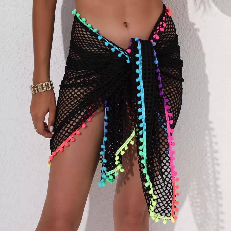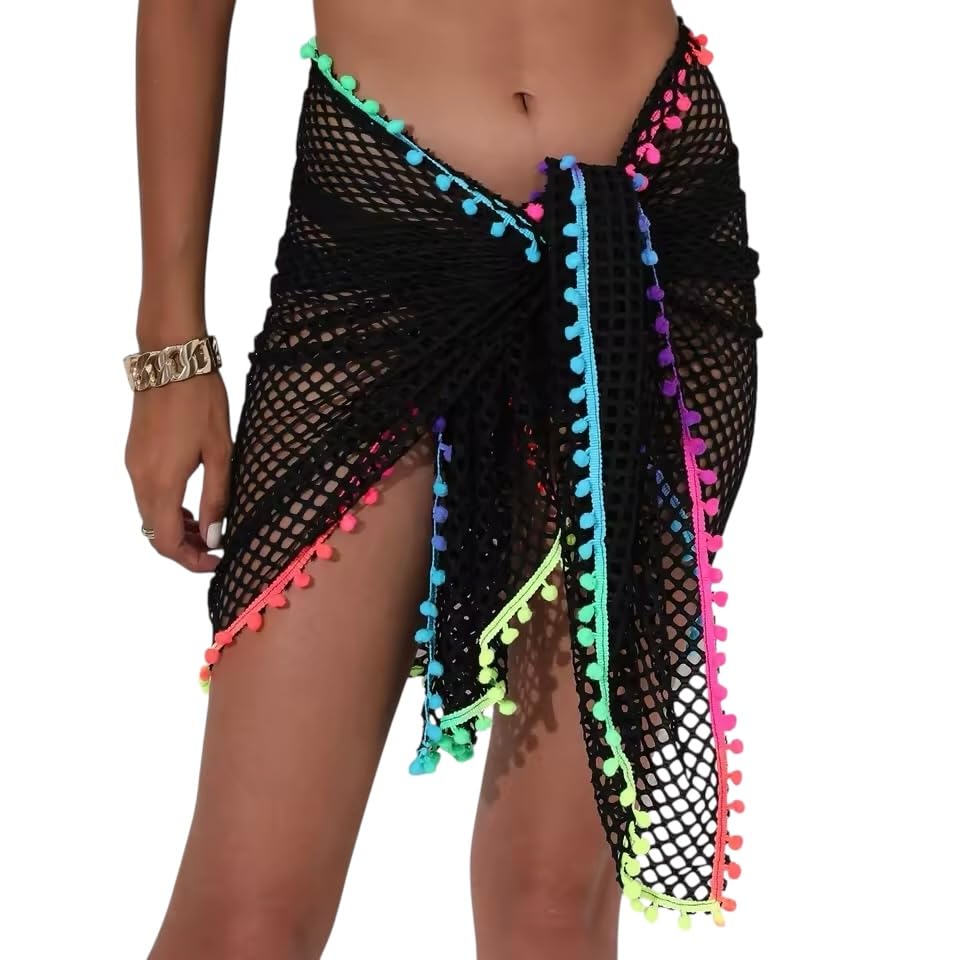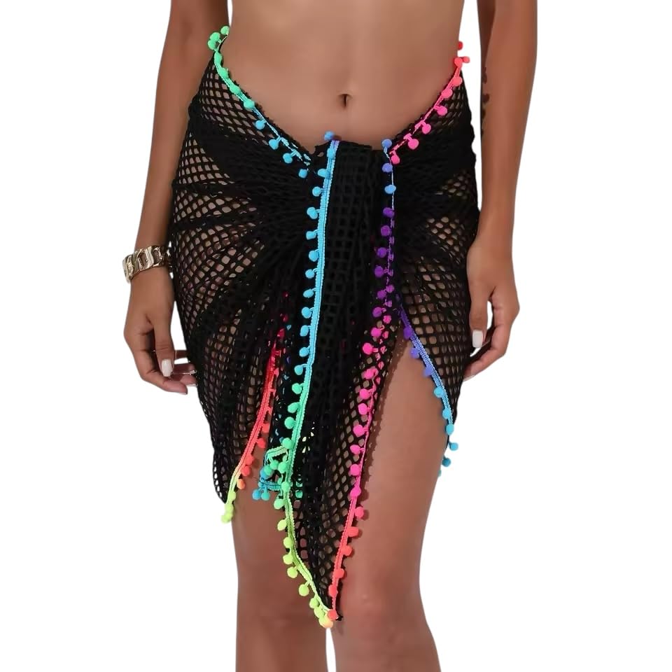 Generic - غطاء شاطئ سارونج شبكي مع حواف بوم بوم بالوان قوس قزح، اسود، تصميم شبكة صيد السمك