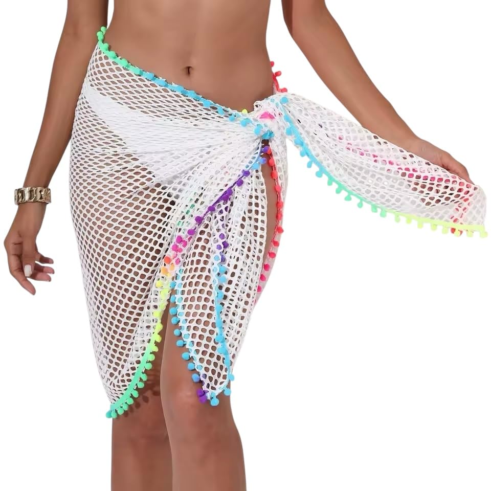 Generic - رداء سارونج للشاطئ مع حواف بوم بوم ملونة، غطاء شبكي ابيض، حواف كروشيه بالوان قوس قزح