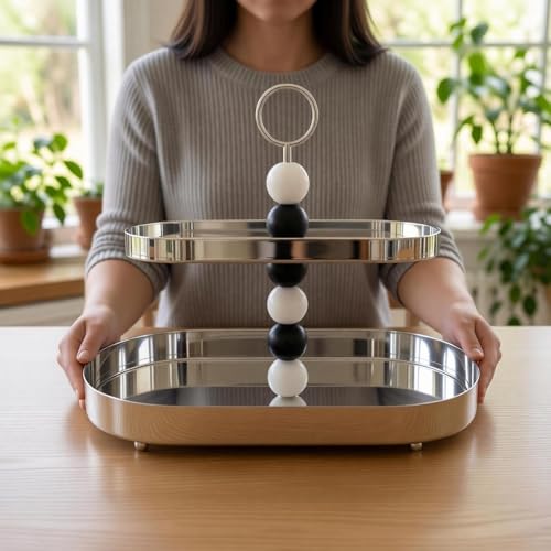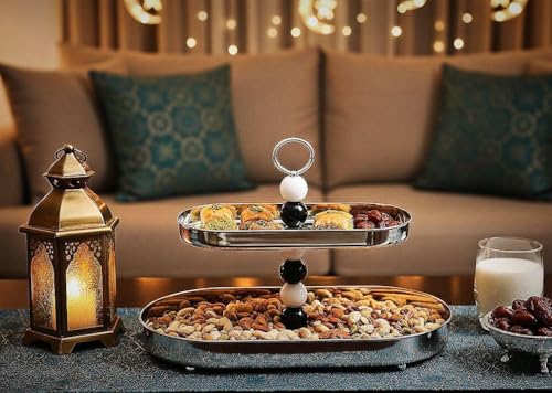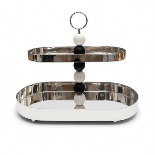 Generic - حامل صينية يد مطرز - حامل تقديم من طبقتين من الستانلس ستيل مع ديكورات أنيقة من الخرز الابيض والاسود، مثالي للحلويات او المقبلات.