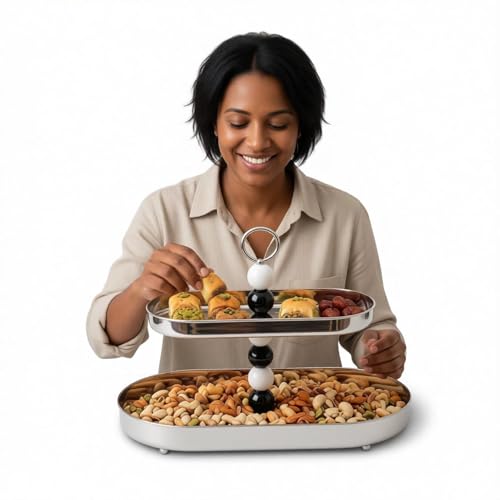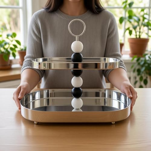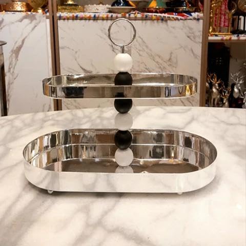 - يتميز تصميم اللوحة البيضاوية المزدوجة بصواني من الستانلس ستيل المصقول مع لمسة نهائية عاكسة، مصحوبة بعمود مركزي جذاب مع كرات زخرفية متناوبة باللونين الأسود والأبيض، مما يوفر جاذبية بصرية أنيقة وارتفاع عملي للتقديم أو العرض.