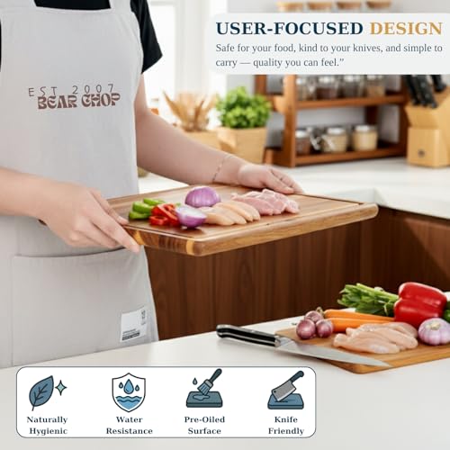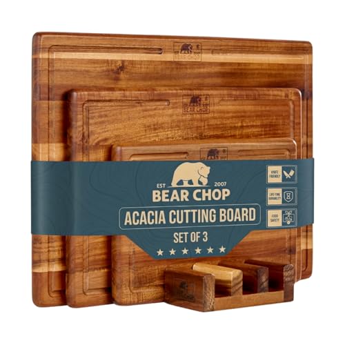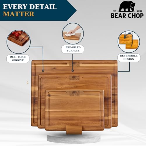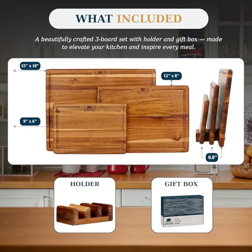 EST 2007 BEAR CHOP - مجموعة الواح تقطيع من خشب الاكاسيا مكونة من 3 قطع مع حامل تخزين، الواح تقطيع خشبية قابلة للعكس للمطبخ مع اخاديد عصير عميقة، مجموعة الواح تقطيع خشبية ممتازة للاعداد والتقديم والهدايا من بيرشوب