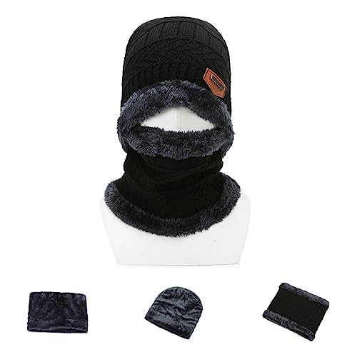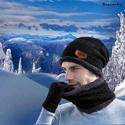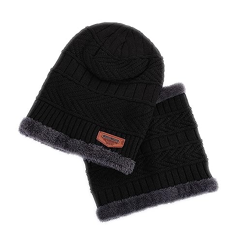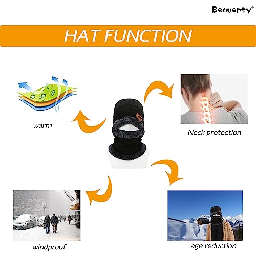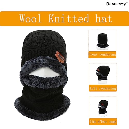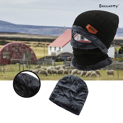 Beauenty - قبعة سميكة محبوكة من قطعتين طقم وشاح وقبعة شتوية سوداء ووشاح للرجال والنساء البالغين دافئة للخريف والشتاء لحماية الرقبة في الهواء الطلق ركوب الخيل اسود 61