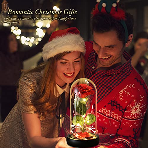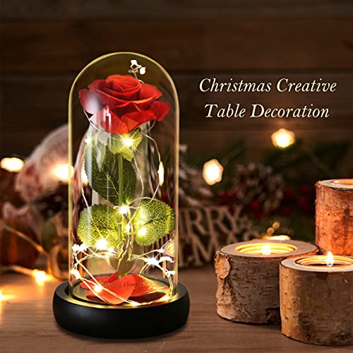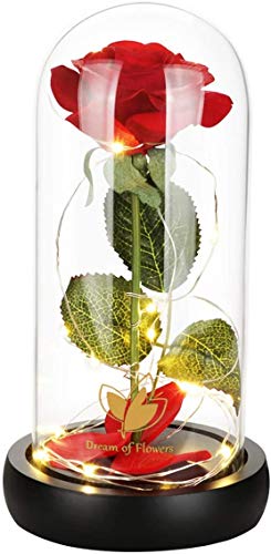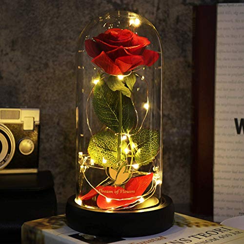 Dream of Flowers - وردة بيوتي اند ذا بيست هدايا عيد الحب للام في قبة زجاجية مع ضوء LED ديكور هدية فريدة للنساء مناسبة لعيد وعيد الأم وهدايا الذكرى السنوية من دريم اوف فلاورز قاعدة سوداء