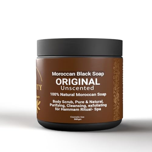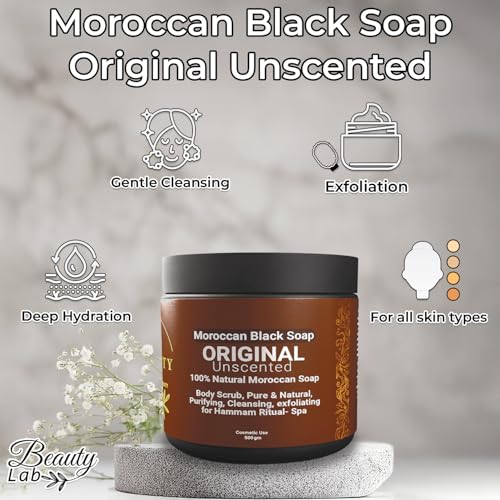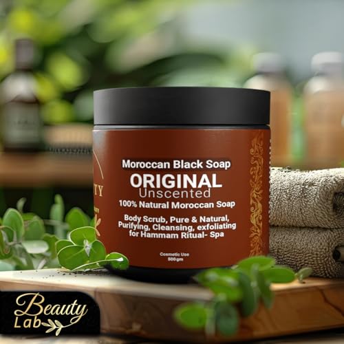 BEAUTYLAB - صابون أسود مغربي طبيعي 100%، مقشر للجسم، تنقية وتنظيف وتقشير لطقوس الحمام، سبا منزلي من بيوتي لاب، 500 جم