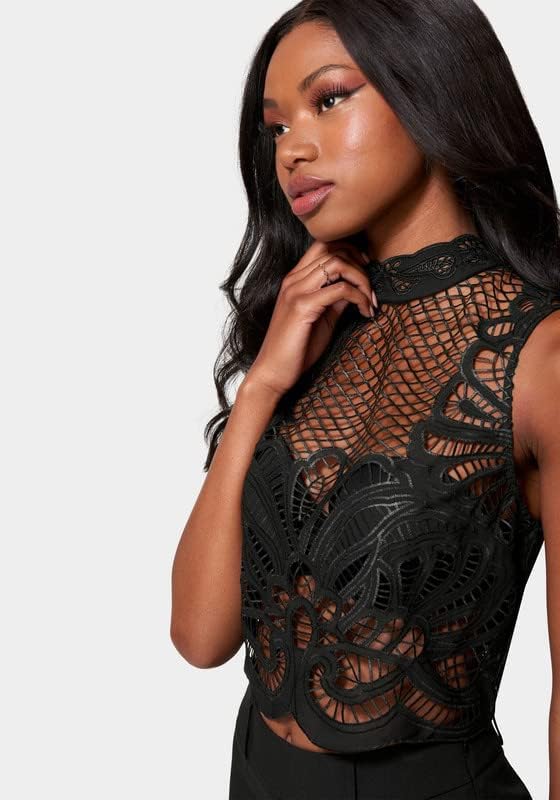 bebe - بيبي بلوزة دانتيل برقبة مرتفعة, أسود، M، للنساء