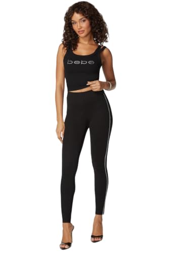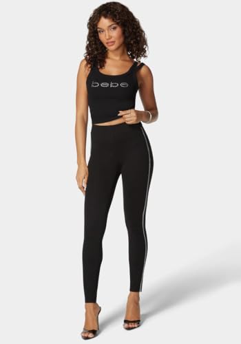 bebe - بيبي سروال ضيق بخصر مرتفع مزين بحجر الراين للنساء، مقاس S، لون اسود