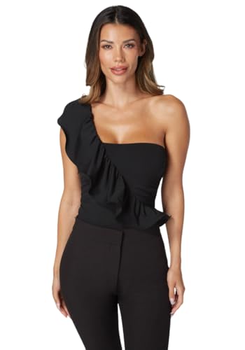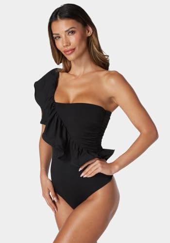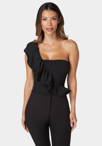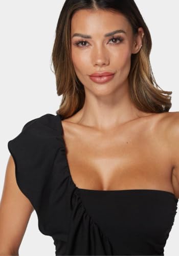 bebe - بيبي سالوبيت بكباسين بكتف واحد مكشكش للنساء، مقاس M، اسود