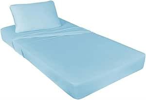 - محتويات المجموعة: طقم ملاءات سرير كامل مكون من 3 قطع يتضمن ملاءة بحواف مطاطية وملاءة مسطحة وغطاء وسادة باللون الأزرق الفاتح