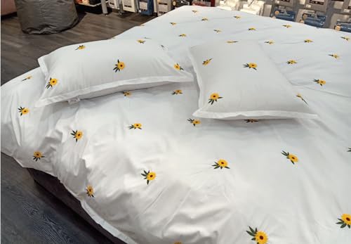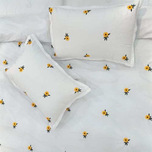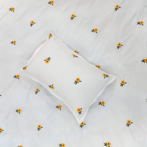 بد اند هوم BedNHome - طقم غطاء لحاف مطرز سادة بزهرة عباد الشمس من بيد ان هوم، أبيض (2.20 × 2.40 م)