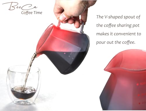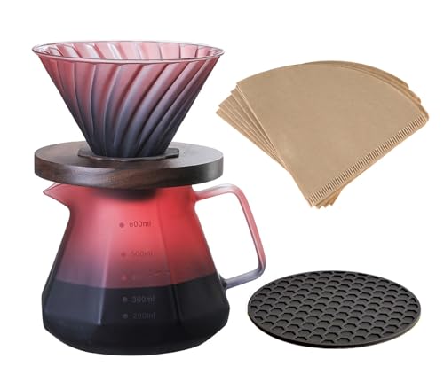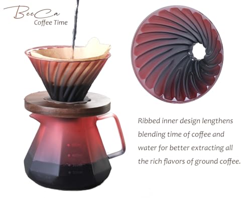 BeeCa - بيكا ماكينة تحضير القهوة من زجاج البوروسيليكات سعة 20 اونصة-600 مل مع منقط قهوة زجاجي وفلتر ورقي V60 ومقبض خشب الجوز وغطاء مجموعة بالتنقيط للمنزل والمكتب والمقهى احمر