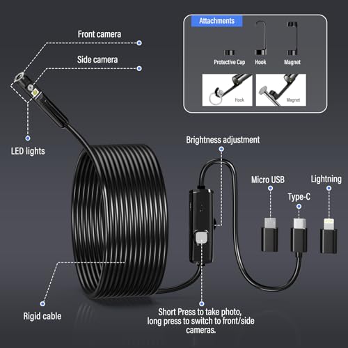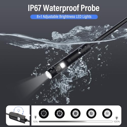 - كاميرا فحص مزدوجة العدسة و8+1 LED : كاميرا المنظار 7.9 ملم يمكنها فحص الأماكن التي يصعب الوصول إليها بسهولة. يوفر لك المنظار الداخلي ذو العدسة المزدوجة رؤية أكثر شمولاً. مزود بإضاءة LED مساعدة 8+1 قابلة للتعديل، مما يضمن صورًا واضحة حتى في البيئات المظلمة.