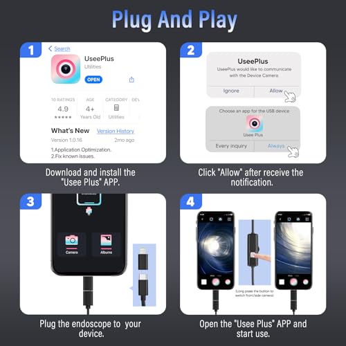 - اتصال سهل: لا حاجة للبلوتوث/واي فاي، امسح رمز الاستجابة السريعة ضوئيًا وقم بتنزيل التطبيق وتوصيل المنظار بهاتفك المحمول. تظهر رسالة "UseePlus للوصول إلى الكاميرا". انقر فوق "السماح" لتفعيل كاميرا الثعبان. تدعم كاميرا المنظار الداخلي JPG وMP4. وظيفة إنشاء تقارير PDF لكاميرا الثعبان أكثر ملاءمة للمحترفين